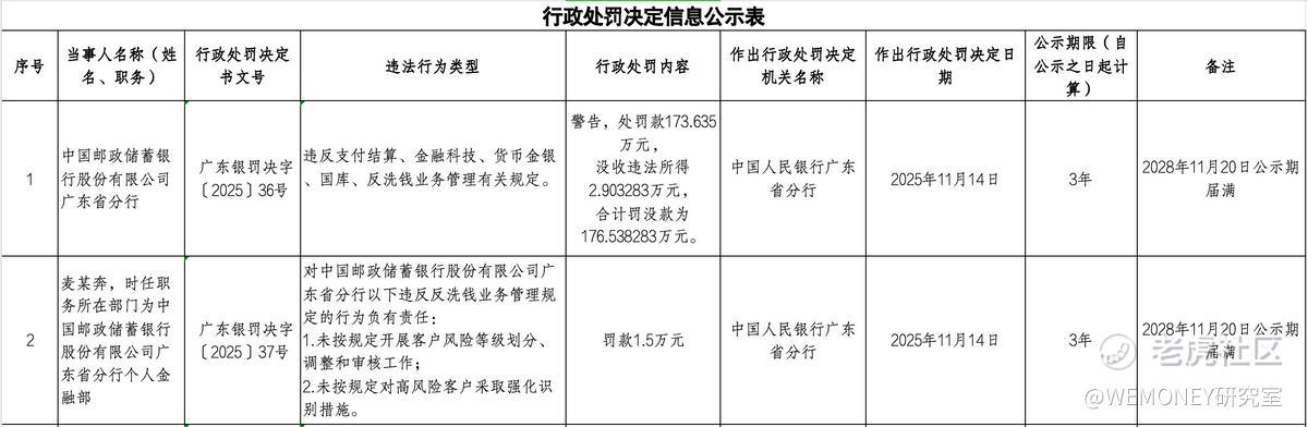 11月21日,中国人民银行广东省分行行政处罚决定信息公示表显示,邮储银行广东省分行,因违反支付结算、金融科技、货币金银、国库、反洗钱业务管理有关规定,被警告,并处罚款173.635万元,没收违法所得2.903283万元,合计罚没款为176.538283万元。