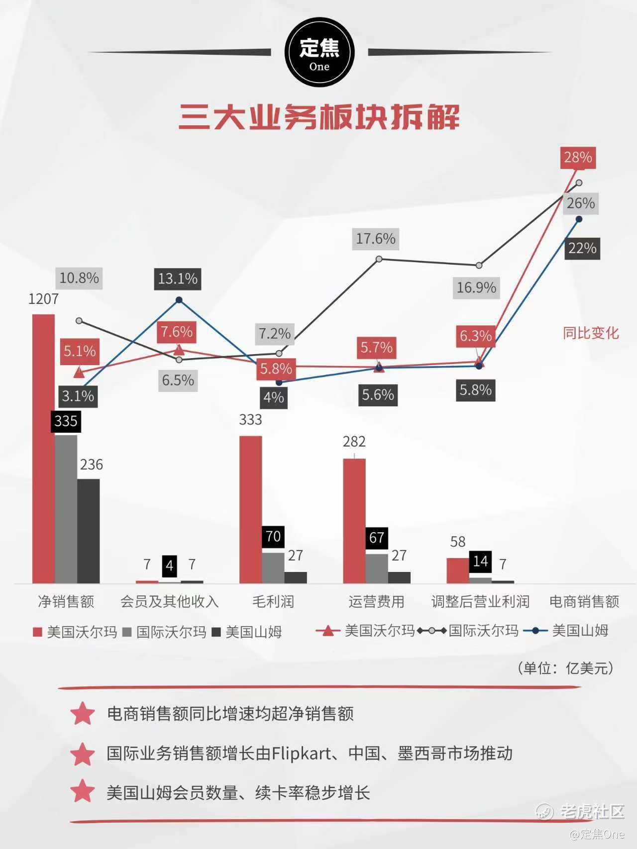 拆分三大业务板块,美国沃尔玛净销售额1207亿美元,同比增长5.1%;调整后营业利润58亿美元,同比增长6.3%。国际沃尔玛净销售额335亿美元,同比增长10.8%,国际销售额增长由Flipkart(沃尔玛旗下印度电商平台)、中国、墨西哥市场推动。美国山姆净销售额236亿美元,同比增长3.1%,会员相关收入增13.1%,电商也有22%的增速。三大业务板块电商销售额同比增速均超净销售额,线上业务成增长引擎。
