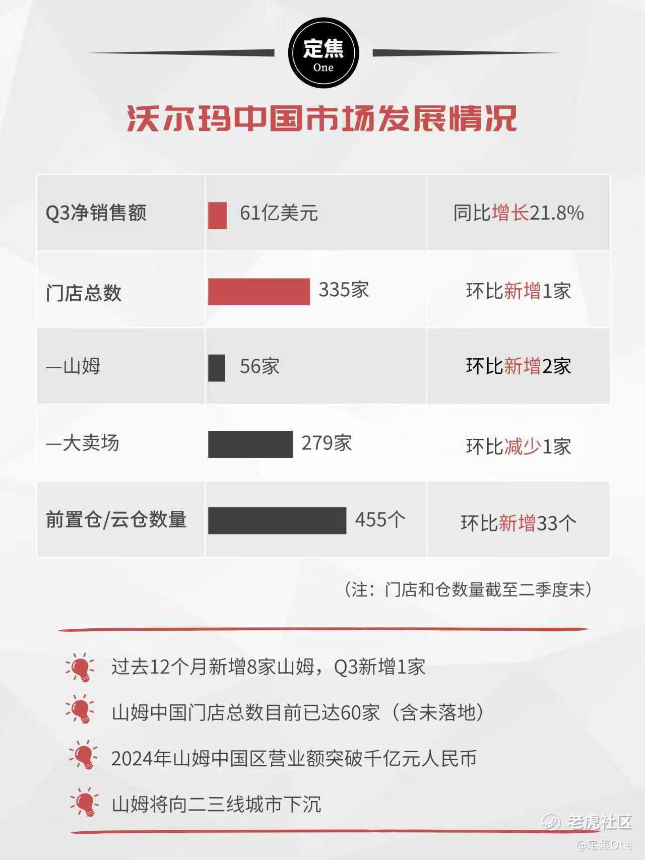 而在此前公布的二季报中,中国市场中,山姆门店数量达56家,大卖场279家,前置仓/云仓有455个;截至二季度末,沃尔玛共有335家门店。