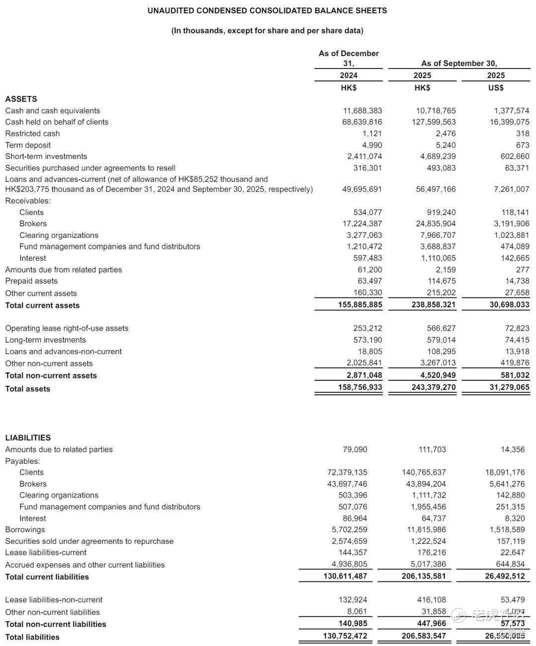 截至2025年9月30日,富途控股总资产为2433.79亿港元(约312.79亿美元),持有的总负债为2065.84亿港元(约265.5亿美元),所有者权益为364.55亿港元(约46.85亿美元)。