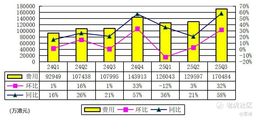富途控股2025年第三季度费用为17亿港元(约2.19亿美元),较上年同期的10.8亿港元增长57.9%。