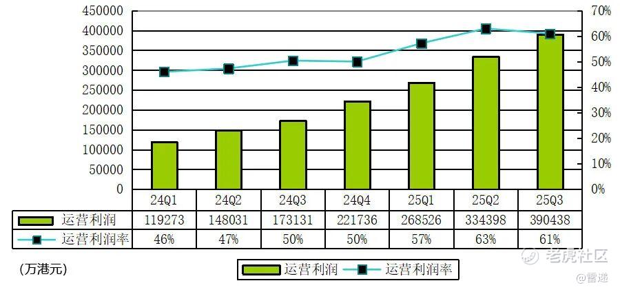 富途控股2025年第三季度运营利润率为61%,较2024年第三季度的50.4%提升了10.6个百分点,主要得益于强劲的营收增长和经营杠杆效应。