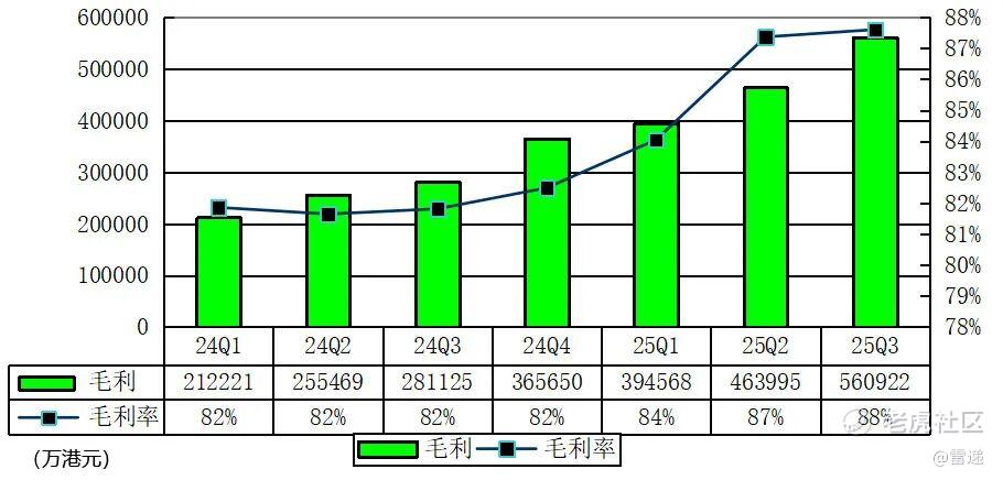 富途控股2025年第三季度毛利为56亿港元(约7.21亿美元),较上年同期的28.11亿港元增长99.5%;富途控股2025年第三季度毛利率为87.6%,上年同期为81.8%。