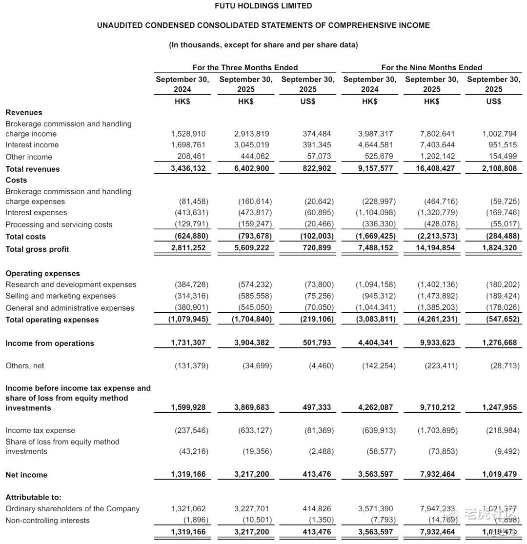 富途控股2025年前9个月运营利润为99.34亿港元(约12.77亿美元),上年同期的运营利润为44亿港元;净利为79.32亿港元(约10.19亿美元),上年同期的净利为35.64亿港元。