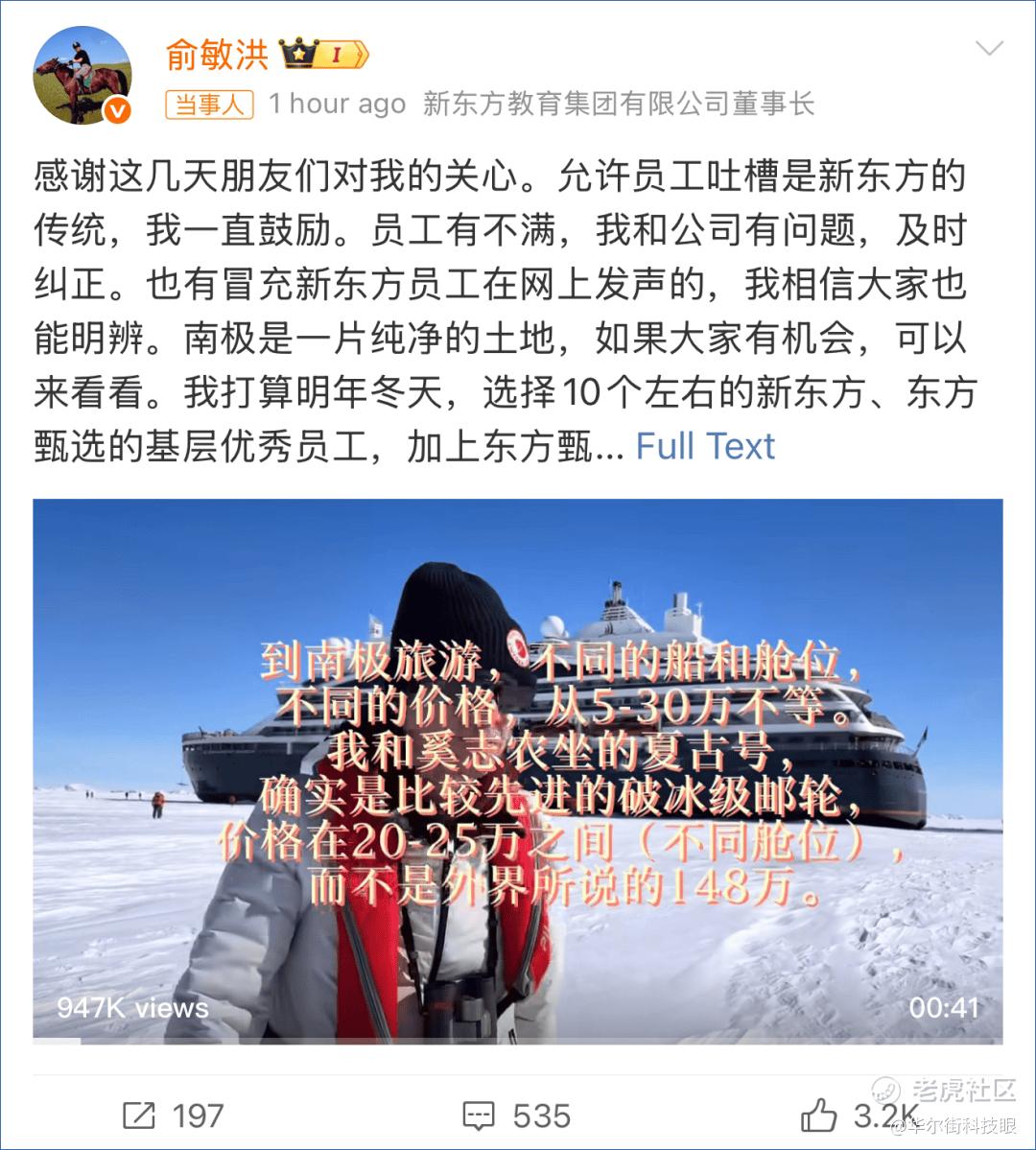 即便此次因南极旅行被员工吐槽“脱离群众”,俞敏洪也未采取强硬回应,而是在内部会议中直言“确实忽略了员工的辛苦付出”,随后宣布“2024年选拔10名优秀基层员工、10名东方甄选核心会员,由公司承担全部费用赴南极考察”,将一场潜在争议转化为员工激励,既化解了矛盾,也传递了企业温度。