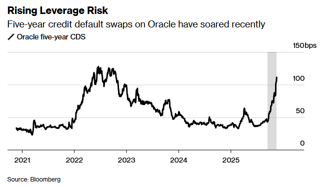 投资者的担忧在相关金融衍生品上体现得淋漓尽致 —— 反映杠杆风险的甲骨文五年期信用违约互换 (CDS) 已飙升至三年来的最高水平。对此,Easterly EAB 全球宏观策略师 Arnim Holzer 表示:“看到甲骨文的 CDS 上升不应该令人惊讶。这些公司正在投入巨额资金并承诺进行巨额资本支出,其中一部分将通过债务融资。这并不意味着甲骨文的股票是垃圾,但它应该会波动更大。”