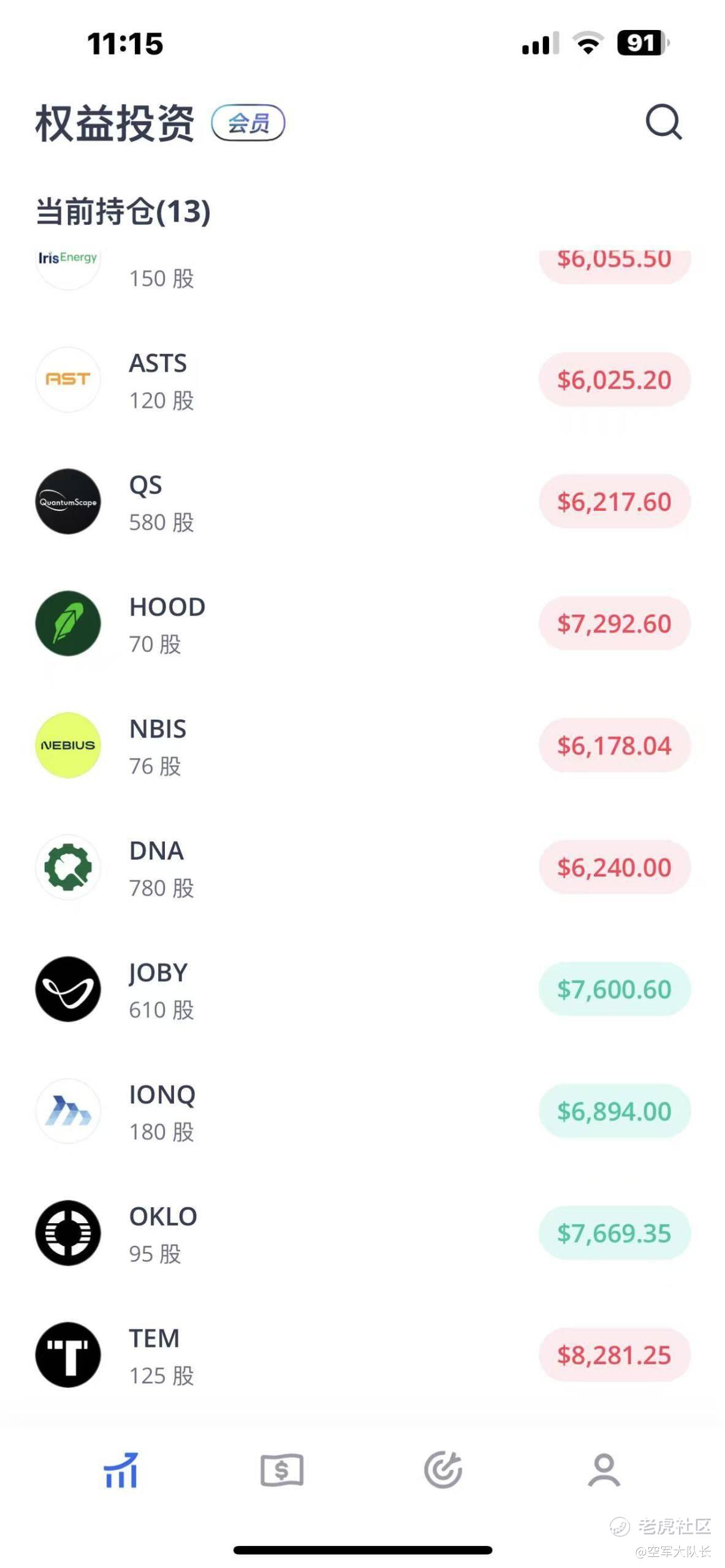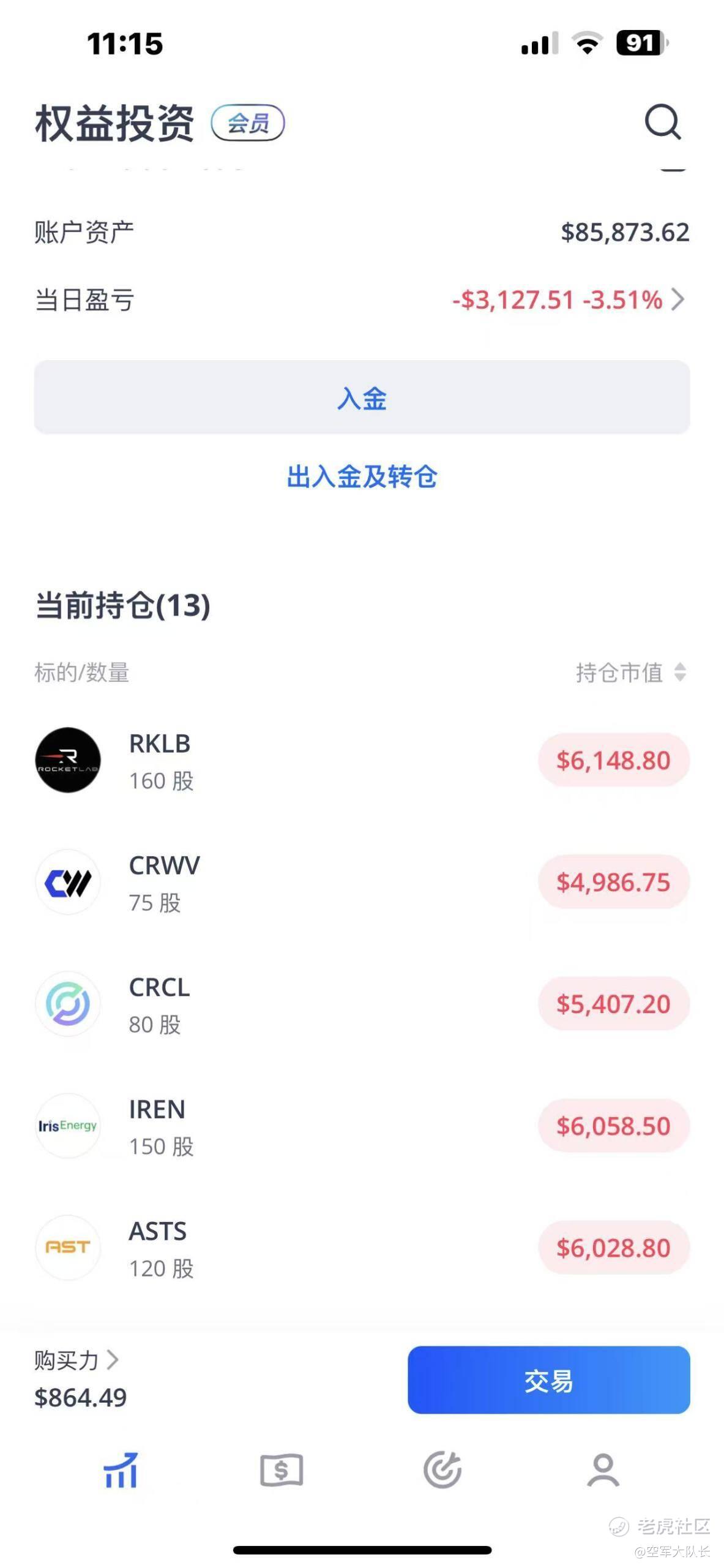 这是我的实盘账户,已经只有8.5万美元了,跌太狠了,从最高15万到现在8.5万跌了40%多了,应该是到底了,你们现在可以抄我的底了,我到10万才能保本,到时候你们赚20%了。虽然特朗普现在乱搞让股市跌跌不休,但是我相信最终还是会起来的,毕竟美股长牛,而且我选的13个股票都是未来前景非常好的行业,短期大跌更是抄底的好时候,不然后面大涨了又后悔,我都不怕亏,你们怕什么,因为我坚信我这13个股票会涨起来的,不是每个都涨,是大部分都会涨。