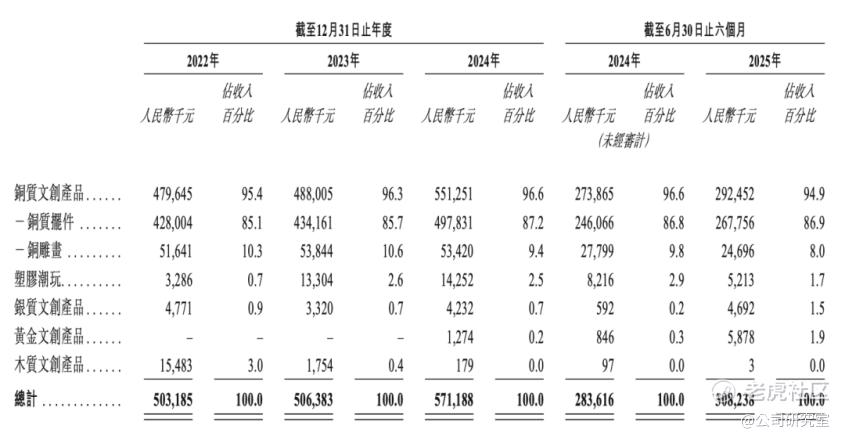 2022年至2024年,公司铜质文创产品收入分别为4.80亿元、4.88亿元和5.51亿元,占营收的比例分别为95.4%、96.3%和96.6%。2025年上半年,这类产品营收2.93亿元,占比94.9%。