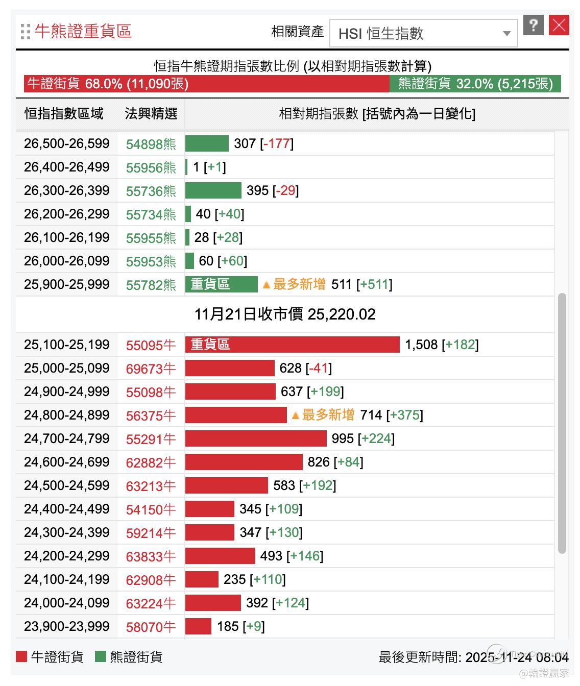 $HSI(HSI)$ 由11月13日嘅高位27188点回落到上个星期五低位25178点,七个交易日累计跌2010点,今朝喺作战室睇到嘅牛熊证街货图都咪话唔一面倒,但完全明白点解啲货会咁摆;又见到呢个街货图,第一层牛又嚟重货,唉~ 系咪真系要咁盲压先?!