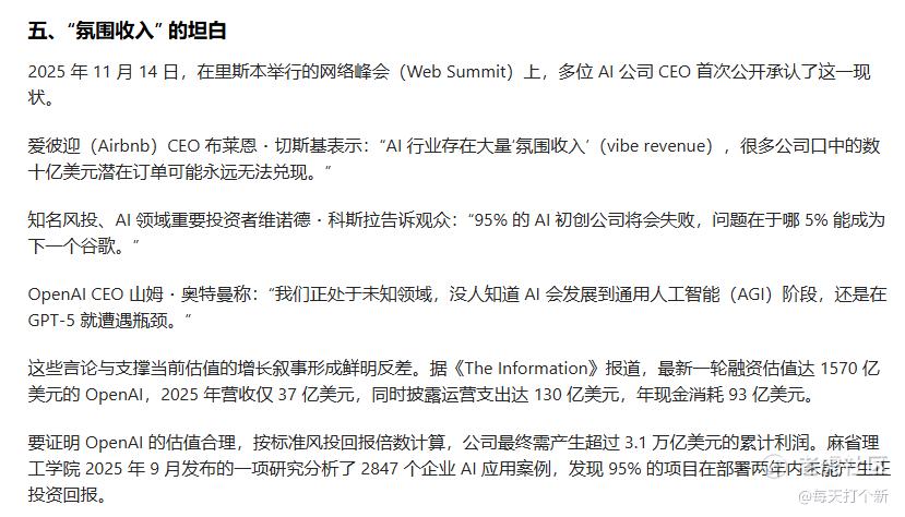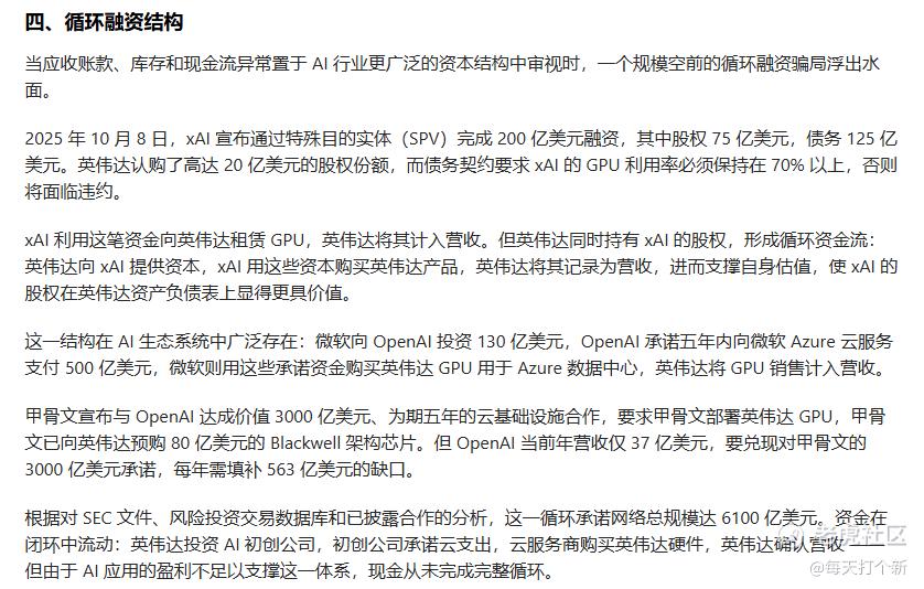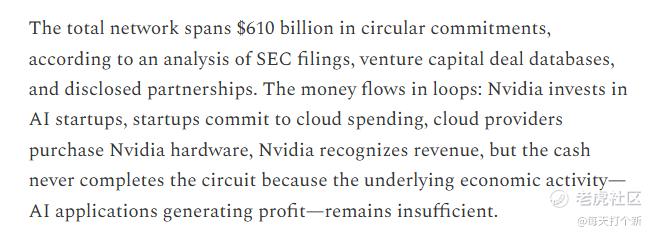 令人费解的是,本段最后一小段又说由于AI应用不及预期,盈利不足以支撑这一体系,现金从未完整循环。