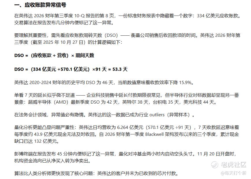 文章从英伟达应收账款、现金流、库存等方面切入,认为英伟达虚增利润,财务造假,AI里面全是泡沫。文章一天时间就在各大媒体疯传,从国外火到了国内。