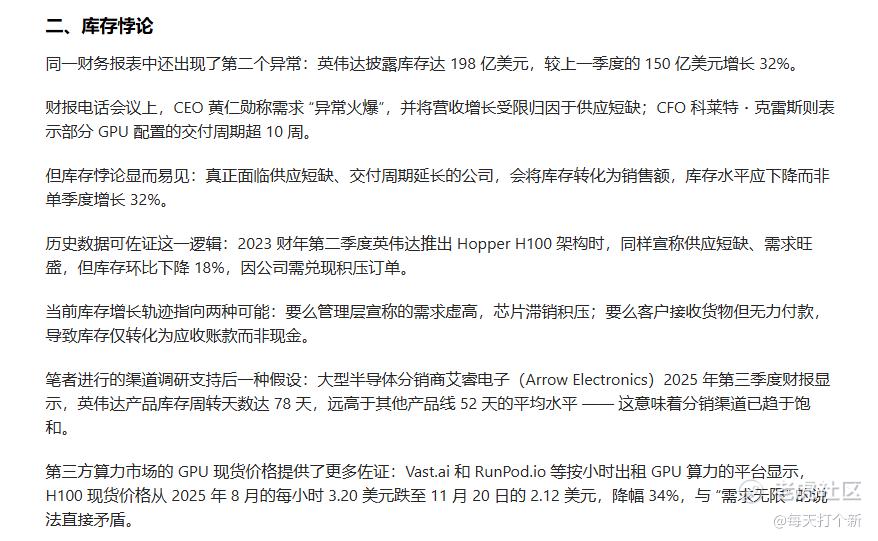 这一段没有什么财务分析漏洞,英伟达库存上升既有可能是如公司所说的战略储备为了锁定长交期元件,支持下一代架构爬坡而主动建库存,也不排除如小沙所言,需求不及预期。