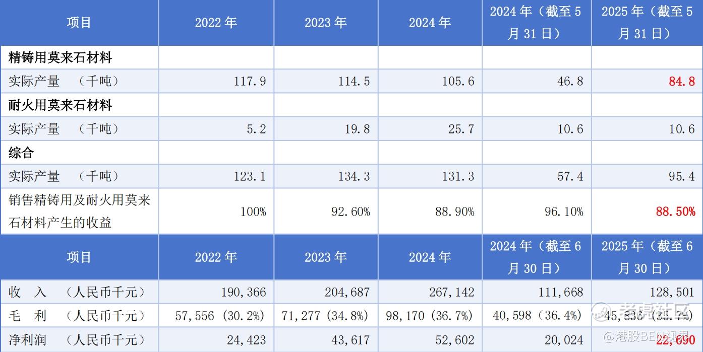 从数据来看,金岩高岭新材2025年上半年精铸用莫来石产量较2024年同期大幅增长,但营收并未同步跟上。公司解释称,主要原因是新投产生产线大幅提升了产能,而销售消化速度暂时滞后于产量扩张。同时,精铸用高岭土莫来石材料的平均售价从2020年的1489元/吨缓慢回落至2025年的1428元/吨。据公司披露,除市场因素外,他们也主动采取降价策略,以进一步扩大市场份额。