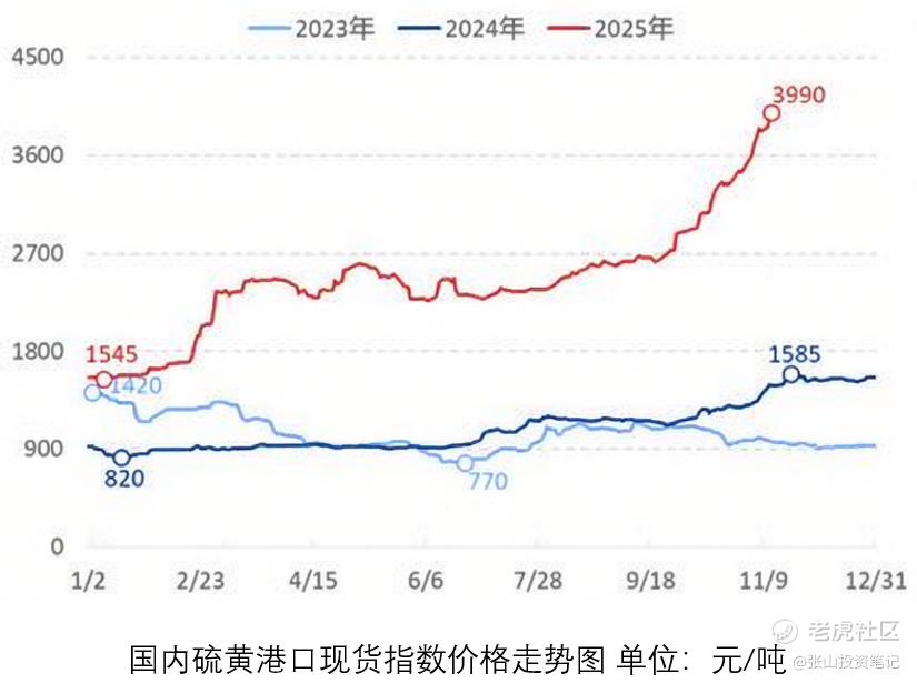 国内硫黄港口现货指数价格在10月中下旬起进入加速上涨,11月中下旬最高报至3990元/吨,逼近4000元大关,近一个多月涨幅超1000元/吨,较年初暴涨约2500元/吨。