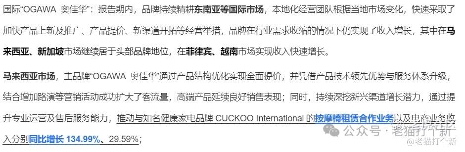 【出海】公司出海确实是一个看点,因为行业中有不少企业在海外租赁按摩椅服务还挺赚钱的,像奥佳华在25H1半年报中,其按摩椅租赁业务就同比增长了135%,环比增长48.6%,不过其采用的是企业合作,奥佳华提供 5D 机芯等中高端按摩椅,CUCKOO 负责线下网点运营。
