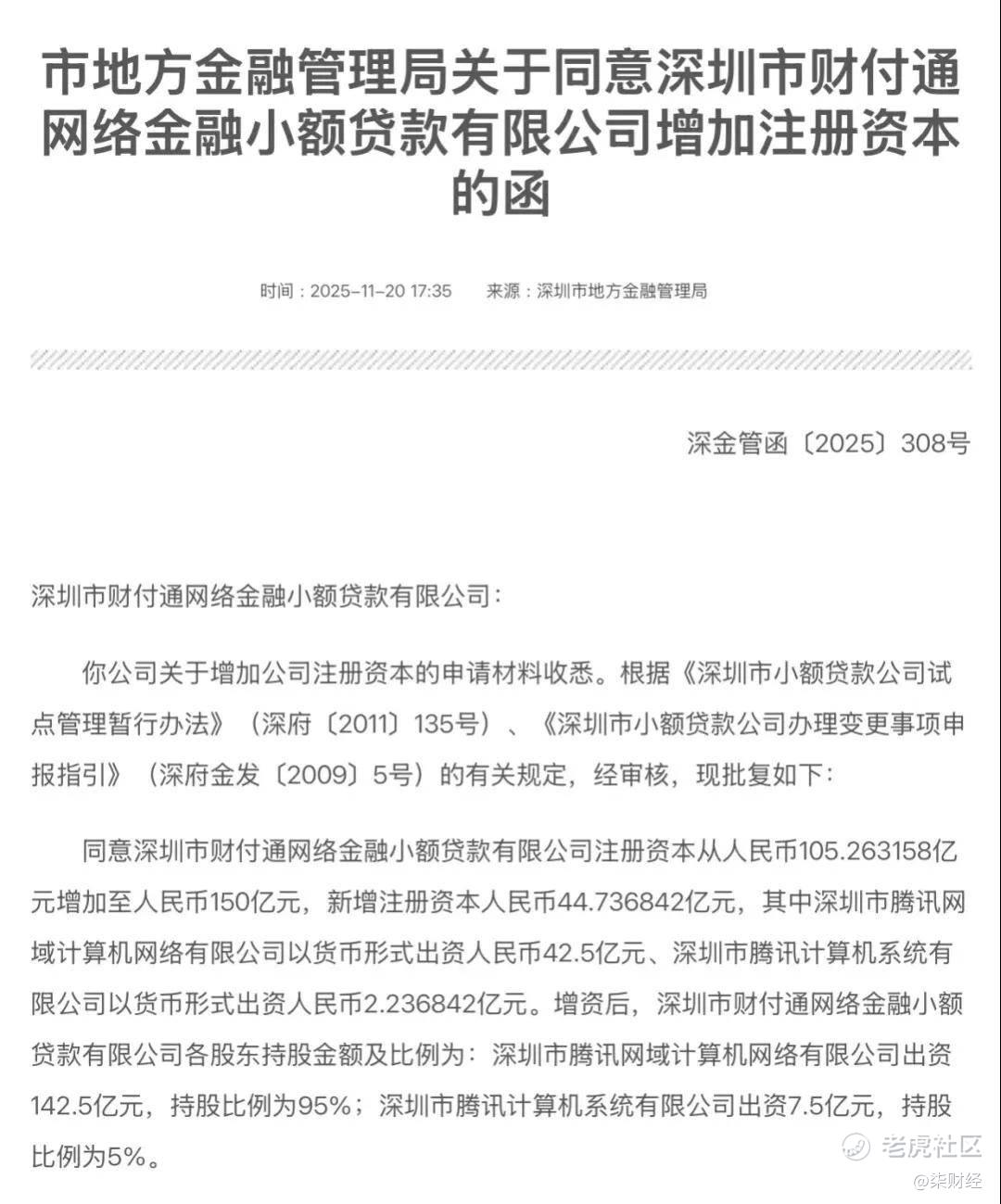 深圳市地方金融监管局批复显示,腾讯旗下财付通网络金融小额贷款有限公司(以下简称“财付通小贷”注册资本由105.26亿元增至150亿元,增幅超42%。