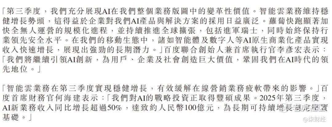 而在财报中,AI也是百度重点着墨的绝对“C”位:AI云强劲增长33%;萝卜快跑全球化提速,本季度订单同比猛增212%,飙升至310万单;在移动生态中,智能体和数字人等AI原生应用也得高增;文心5.0(文小言)展现强大性能……