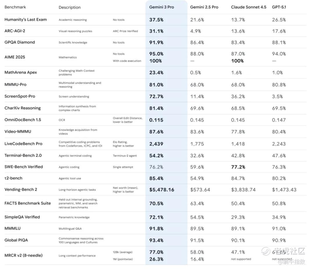 1020亿美元的季度营收、16%的同比增长,各条业务线均取得不俗业绩的情况下,向来在海外被AWS云服务压制的谷歌云取得34%的爆发式增长。新发布的Gemini 3在多个独立测试基准中击败GPT-5登顶榜首,无论是在海外还是在国内,都有不少的使用体验发布,均显示出其在实际场景中的性能和表现。