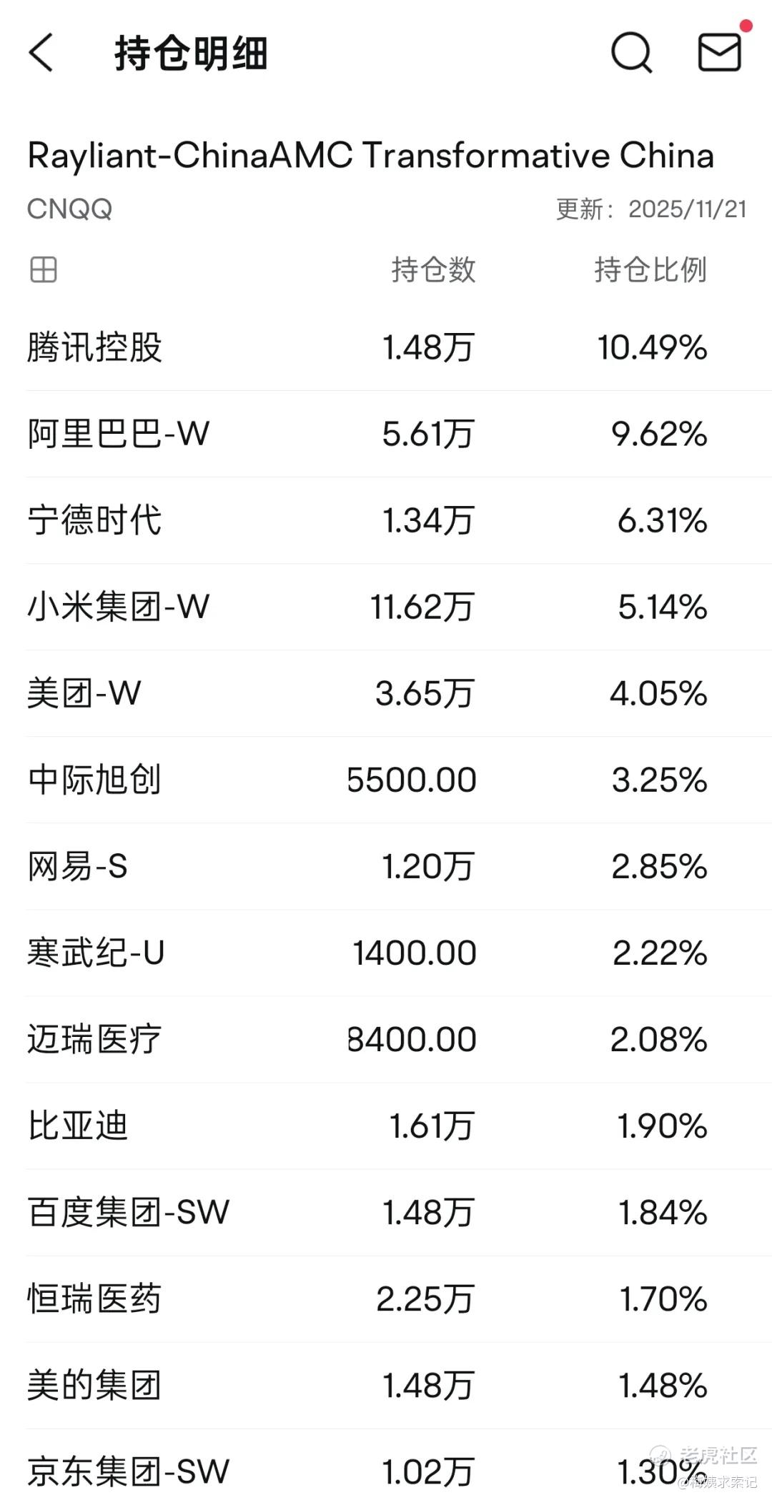 简言之,它投了100家中国核心的科技企业。梅姨拉了一下它持仓前几名的股票,大家可以感受下。