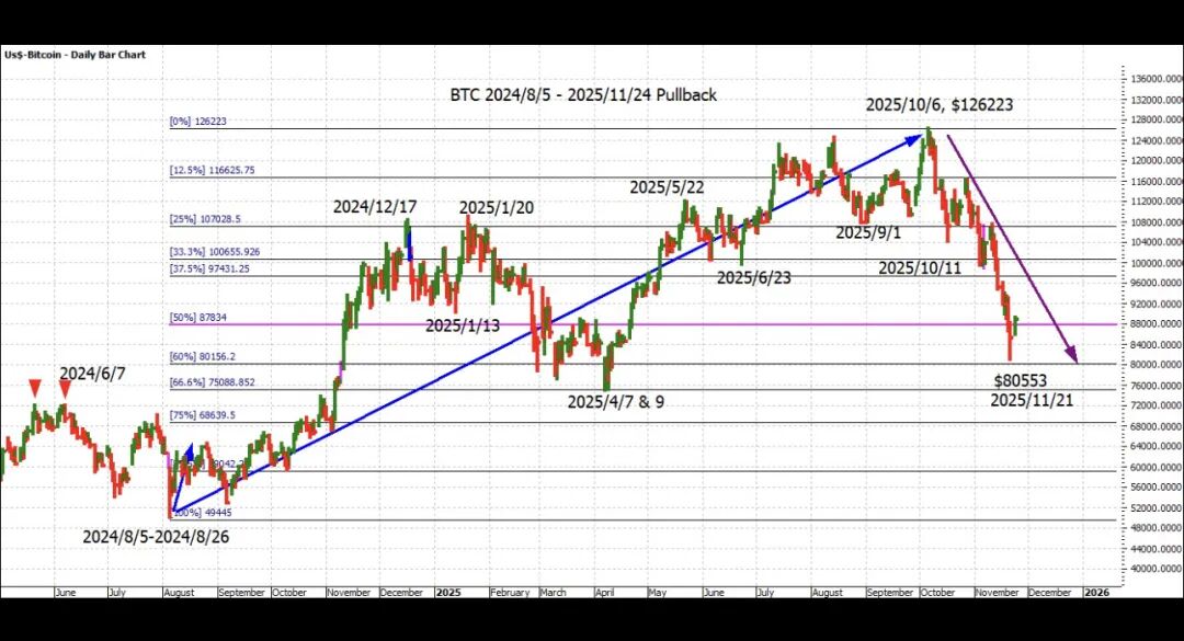 →下图粉色线是总升幅的50%位置,也是牛熊分水岭。昨天比特币己经重上50%之上。