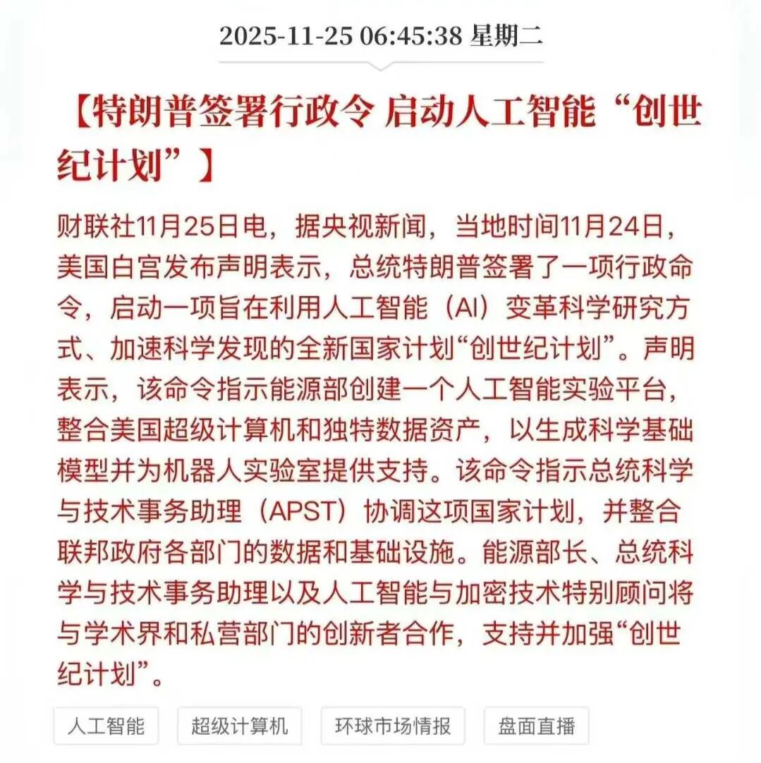 特朗普24日签署了一项行政命令,启动利用人工智能变革科学研究方式、加速科学发现的国家计划“创世纪计划”。