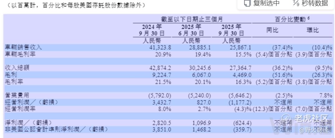 根据理想汽车(2015.HK)发布的2025年三季度财报,收入总额为274亿元,同比减少36%,环比减少9.5%。
