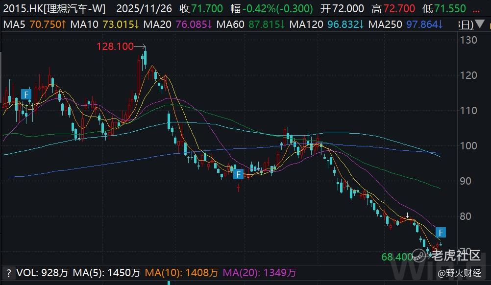 从年初至11月26日,理想港股累计跌约24%;蔚来涨26%,小鹏涨76%,总市值也超越了理想,排在蔚小理第一。
