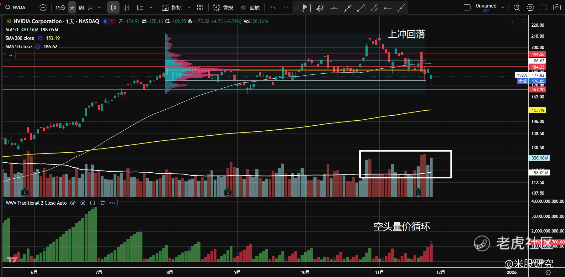 $英伟达(NVDA)$自8月份以来一直横盘震荡,11月假突破后带量下跌,目前成交量还在持续放大,空头量价循环,建议观望。