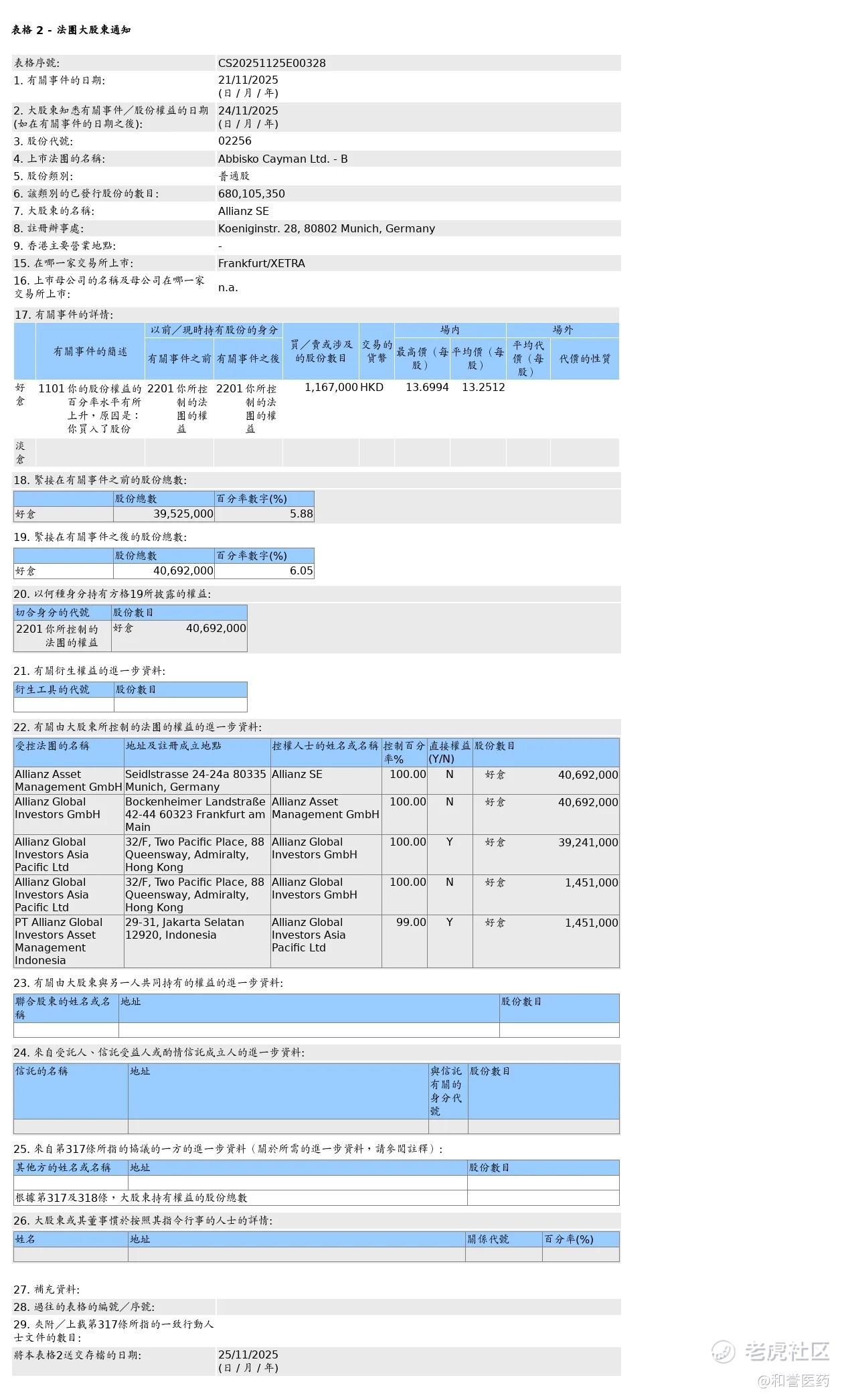 11月26日报道,根据香港联交所11月26日披露的文件,Allianz SE于11月21日以每股均价13.2512港元增持 $和誉-B(02256)$ 116.7万股普通股股份,价值约1,546.42万港元。增持后,Allianz SE最新持股数目为4,069.2万股股份,好仓比例由5.88%升至6.05%。