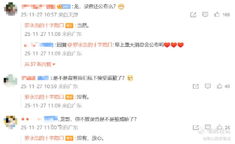 有网友问及,“是不是背着我们私下接受道歉了?”罗永浩回复称,没有。 还有网友问及“不放录音是不是被威胁了”,罗永浩表示,“没有,放心。”关于之前提到的录音是否还公布,罗永浩表示,当然。