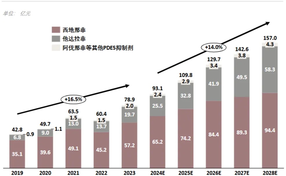 相关数据显示,2019-2023年,中国抗ED药物行业规模已从42.8亿元快速增长到78.9亿元,年复合增长率约为16.5%,预计2024-2028年将从93.1亿元进一步增长至157亿元。