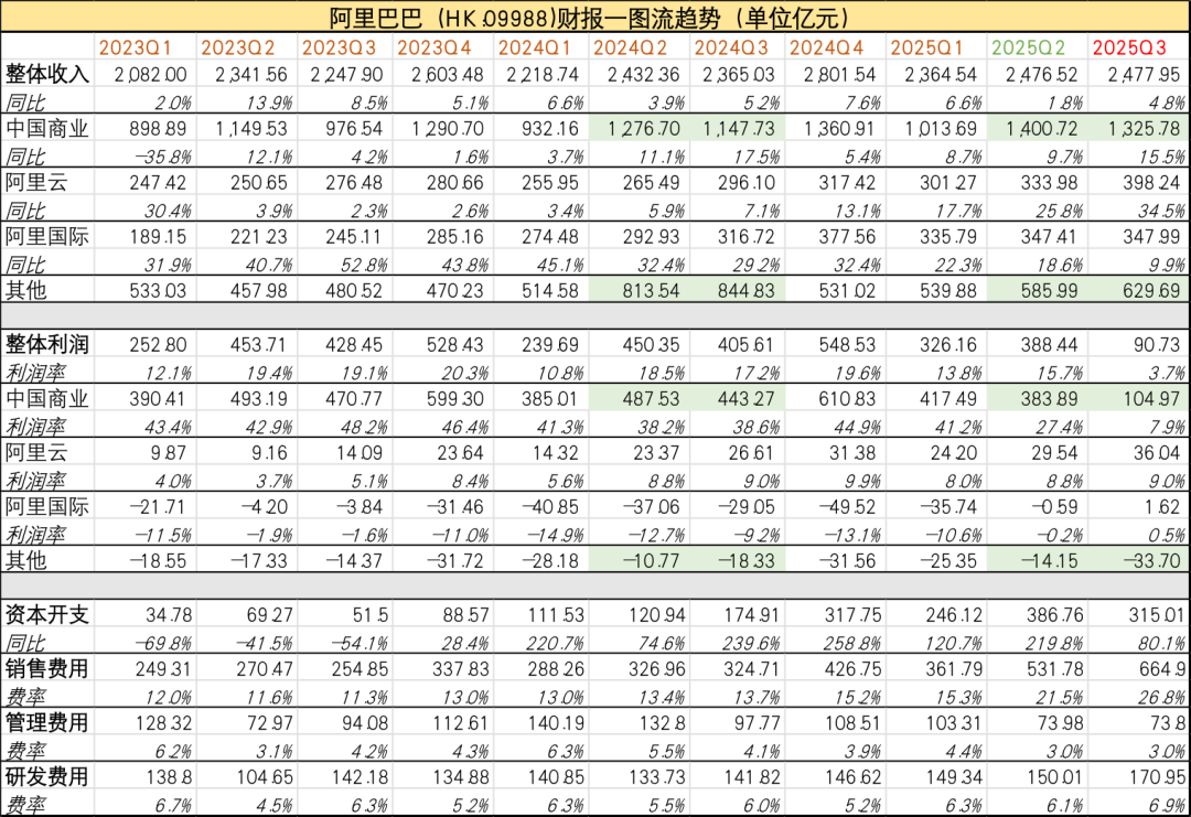 北京时间11月25日,阿里巴巴发布截至2025年9月30日的第三季度业绩。财报显示,阿里巴巴营收达2478亿元,略高于市场预期;经调整EBITA却仅为90.73亿元,同比大幅下滑73%;Non-GAAP净利润为103.52亿元,同比下降72%,低于预期。核心财务数据如下图所示(绿色为调整后口径,非同期不可直接比较):