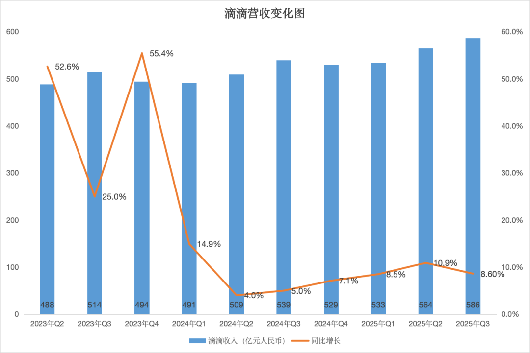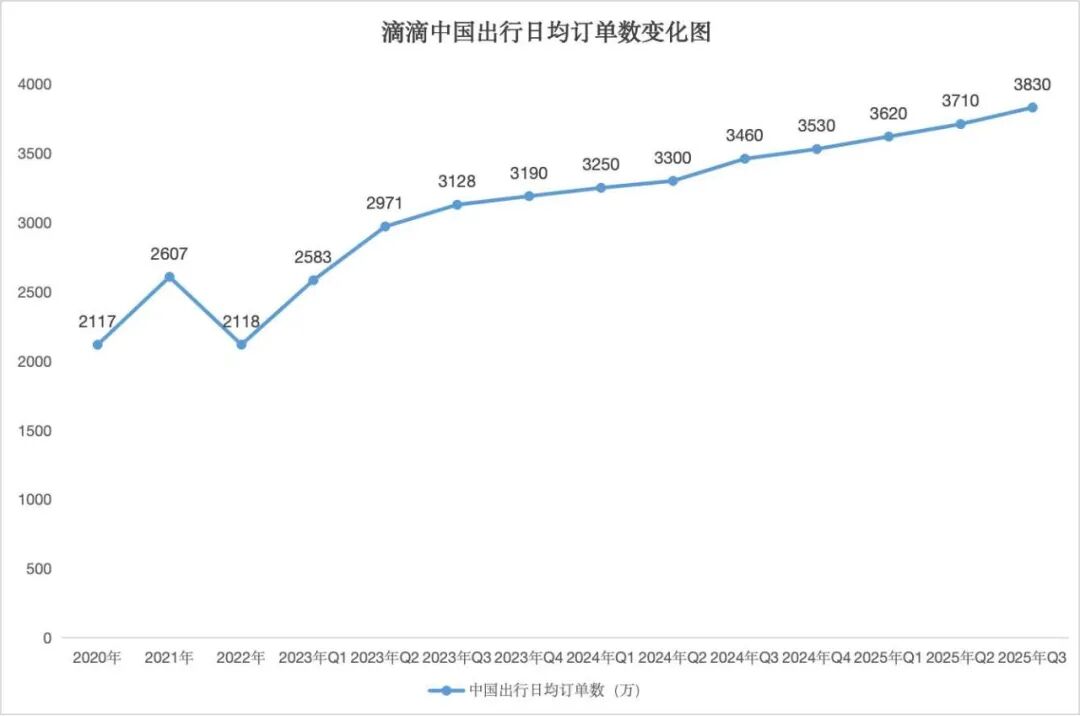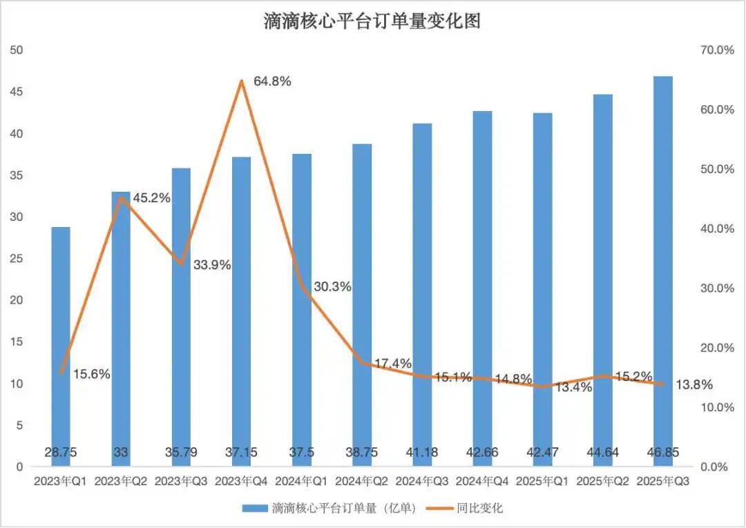 根据财报数据,三季度滴滴核心平台(包括中国出行和国际业务)订单量同比增长13.8%,攀升至46.85亿单,日均订单数突破5000万。这也是自2023年以来,滴滴订单量连续11个季度保持了同比双位数的稳定增长