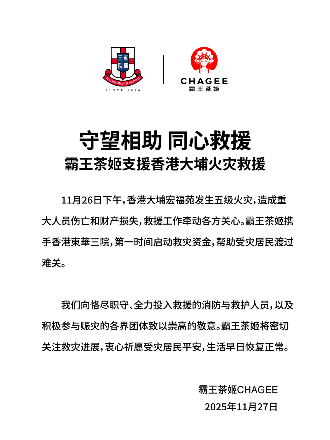 霸王茶姬支援香港大埔火灾救援