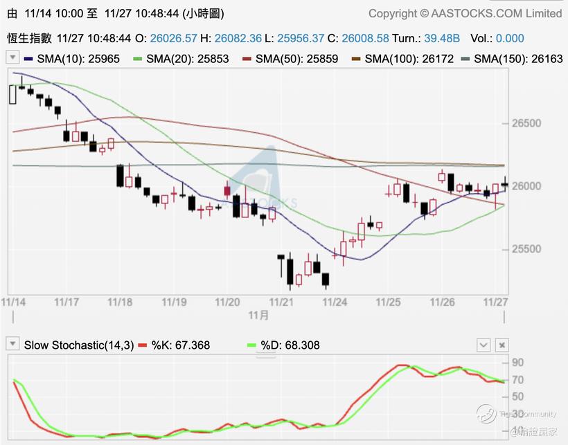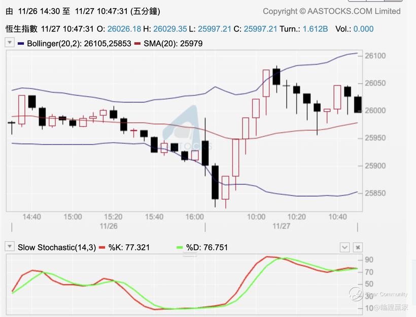 $HSI(HSI)$ 今朝开升17点,但见五分钟图Slow STC(14.3)有触底嘅情况,所以都喺作战室Mark住好仓出借Slow STC(14.3)出触底而出好仓,呢一注快食过后到依家10点47分,指数目前都还在26000点上落。