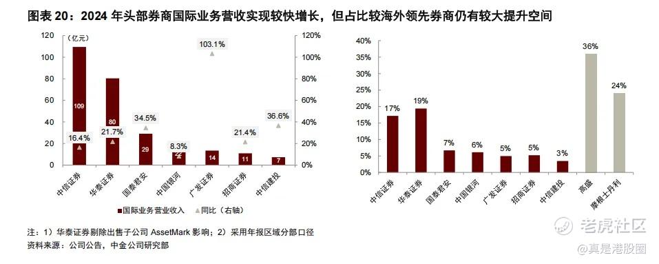 中金认为,中资行相比外资行仍有较大提升空间。例如,高盛国际业务营收占36%,大摩占24%,而华泰证券仅为19%。