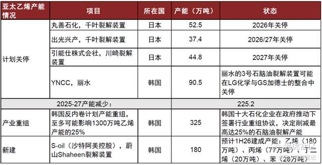 日韩市场同样承压。日本乙烯装置开工率连续两年低于80%的盈亏平衡点,2025年6月更跌破70%,创2009年以来新低。在总计650万吨乙烯产能中,约97.5万吨面临长停或关闭风险。出光兴产、丸善石化、引能仕等企业已宣布可能于2026-2027年关停或重组相关设施,影响产能约135万吨。