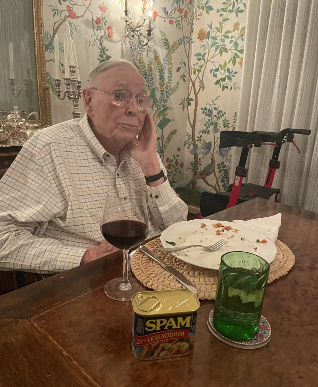 2021年,芒格对眼前这道午餐肉料理显得颇为失望/摄影:惠特尼·杰克逊(Whitney Jackson)