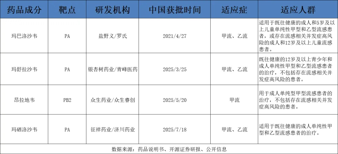 青峰医药的玛舒拉沙韦片、众生药业的昂拉地韦片、济川药业的玛硒洛沙韦片相继获批,成为首批上市的国产创新抗流感药。同时,健康元的玛帕西沙韦、先声药业的玛氘诺沙韦亦已提交新药上市申请,距离正式获批仅一步之遥。