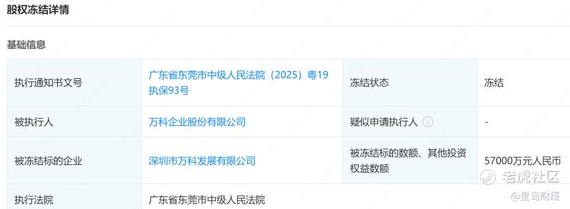 近日,企查查信息显示,万科企业股份有限公司旗下深圳市万科发展有限公司(下称“深圳万科”)股权被冻结,冻结股权数额达到人民币5.7亿元,执行法院为广东省东莞市中级人民法院。