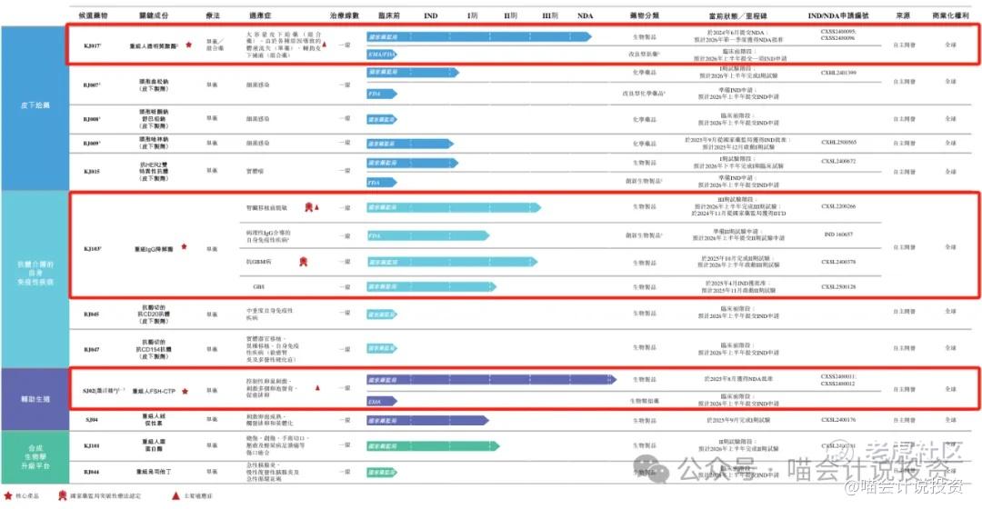 我们的核心产品包括:(i)SJ02(晟诺娃®),是一种长效重组人卵泡刺激素羧基末端肽融合蛋白(FSH-CTP),作为辅助生殖,用于进行控制性卵巢刺激、促进多囊泡发育及诱发排卵,于2025年8月获得国家药监局NDA批准;(ii)KJ017,是一种处于NDA阶段的重组人透明质酸酶,用于大容量皮下给药(联合治疗)、由于各种原因导致的体液流失(单药治疗)、辅助皮下补液(联合治疗);及(iii)KJ103,是一种处于III期开发阶段的创新重组免疫球蛋白G(IgG)降解酶,用于治疗肾脏移植前脱敏及病理性IgG介导自身免疫性疾病。