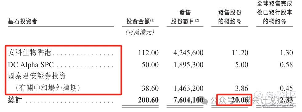 基石投资者:3家,2个亿,20%,其中安科生物就是接Organon班,签SJ02在大中华区的独家销售代理协议的(6分)。