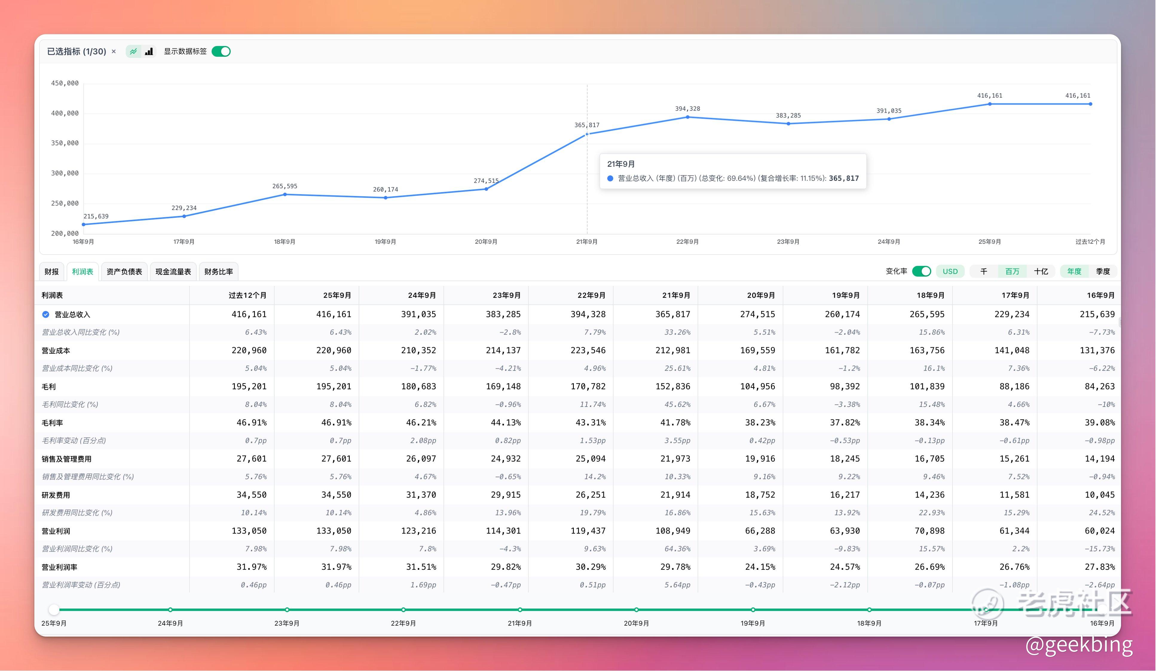 新增美股最近 10 年 & 20 季度财报指标瞬转图表趋势分析。