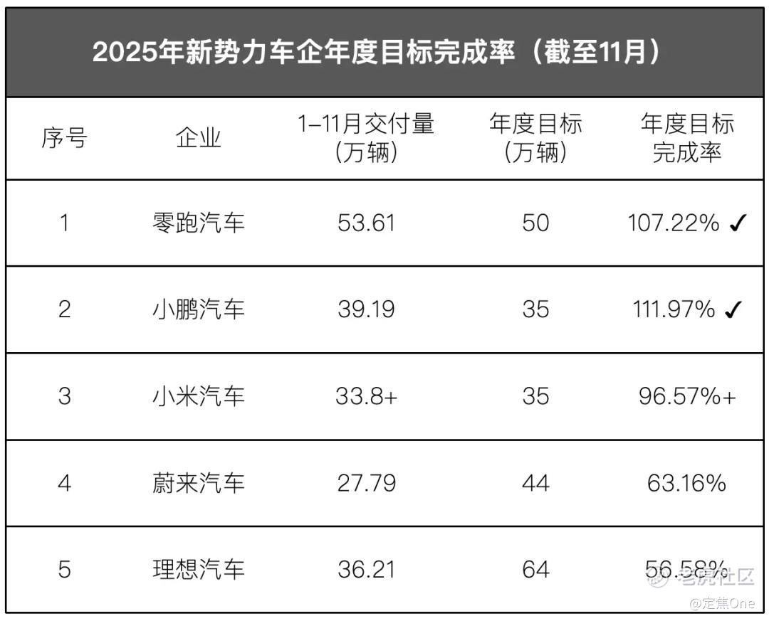 零跑(107.22%)和小鹏(111.97%)“提前交卷”;小米(96.57%+)已经一只脚迈线,完成目标没有悬念;