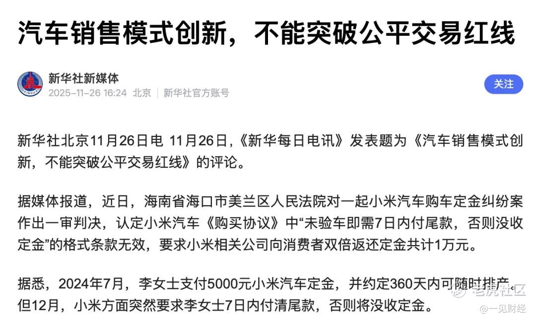 《新华每日电讯》在评论中称,法院对小米汽车定金纠纷案的判决,为“先订后产”新模式划下了红线,也警示业界:无论销售模式如何创新,都要维护好市场的公平秩序。