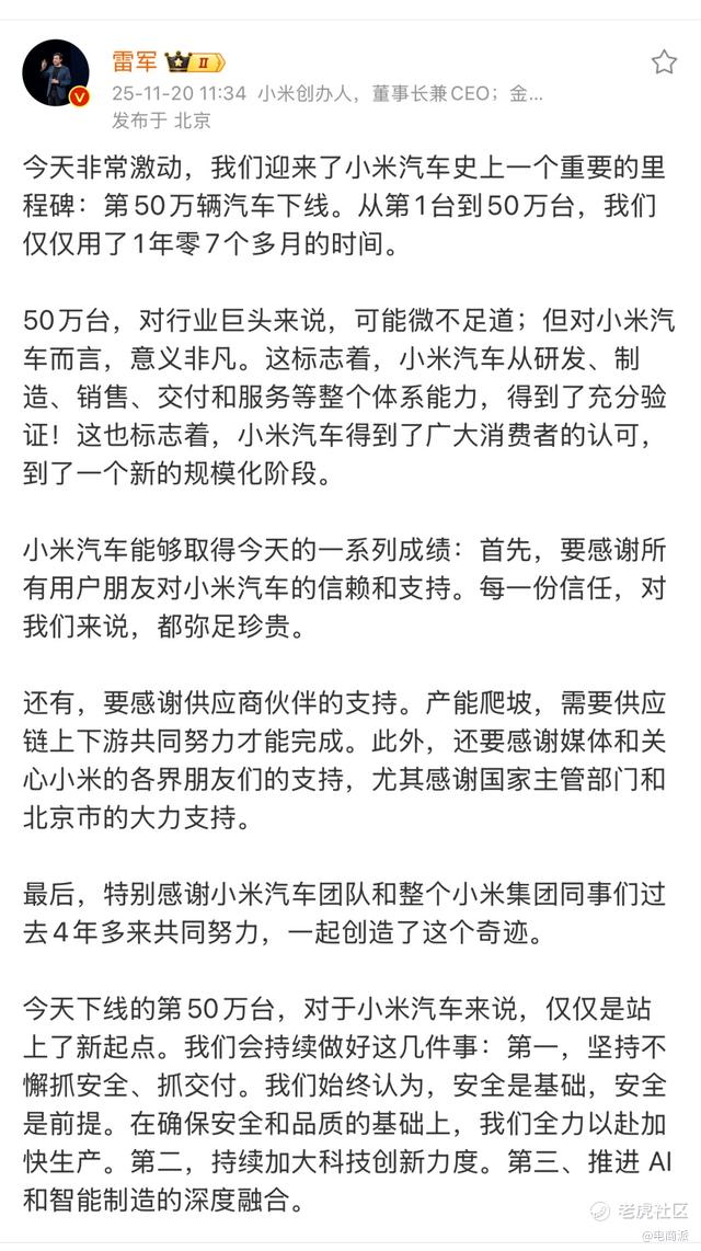 彼时雷军在现场表示,要持续做好三件事:一是坚持不懈抓安全、抓交付,2025年预计交付量将超过40万台;二是持续加大科技创新力,2025全年研发费用预计达到320亿元-330亿元;三是推进AI和智能制造融合。