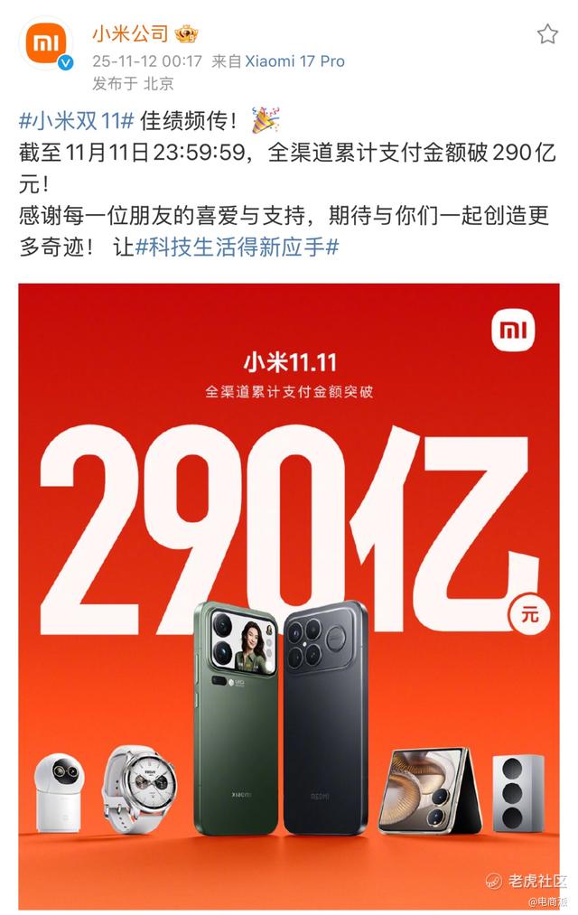 在今年双11,小米手机的表现依旧强劲。小米官方公布战报显示,截至11月11日24 时,小米全渠道累计支付金额突破 290 亿元。