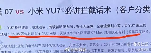 有的友商还专门写了“截单话术”,主动联系YU7车主劝其转单。主编猜测,小米一些全新现车“部分用户因不可抗力无法提车的车辆”极有可能是被友商成功截胡的订单。