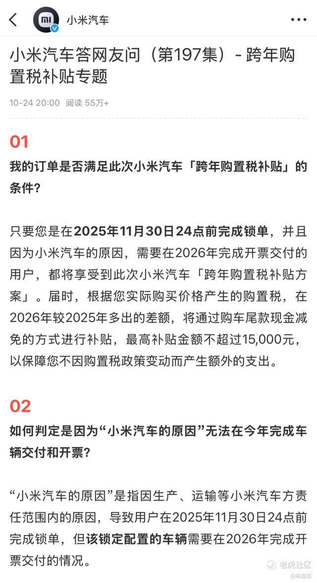 为此,今年10月,小米汽车还特地发布了跨年购置税补贴方案,在2025年11月30日24:00前完成锁单,因小米汽车的原因,该锁定配置的车辆需在2026年完成开票交付,可享受跨年购置税补贴。