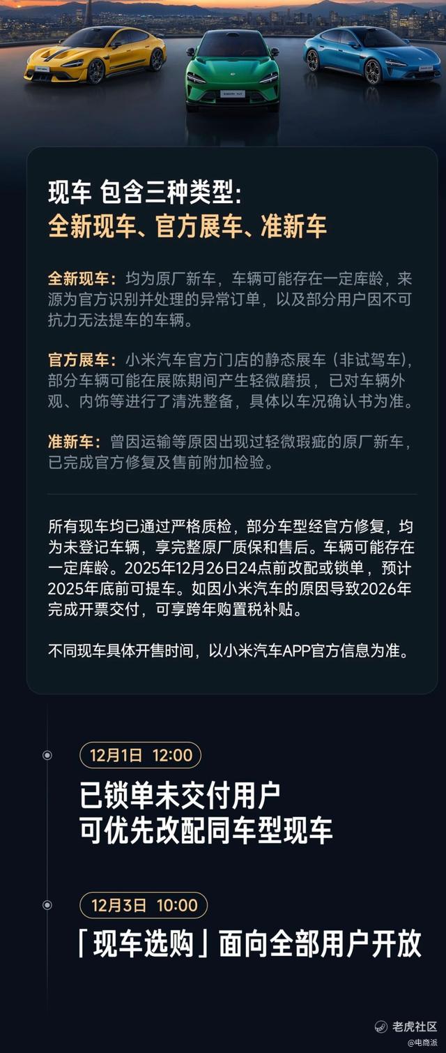 从时间来看,小米汽车这次的交付速度确实“一键加速”了。2025年12月26日24点前锁单,预计2025年底前可提车。如因小米汽车的原因导致2026年完成开票交付,可享跨年购置税补贴。12月1日12点,已锁单未交付用户可优先改配同车型现车。12月3日10点,「现车选购」面向全部用户开放。不同现车具体开售时间,以小米汽车APP官方信息为准。
